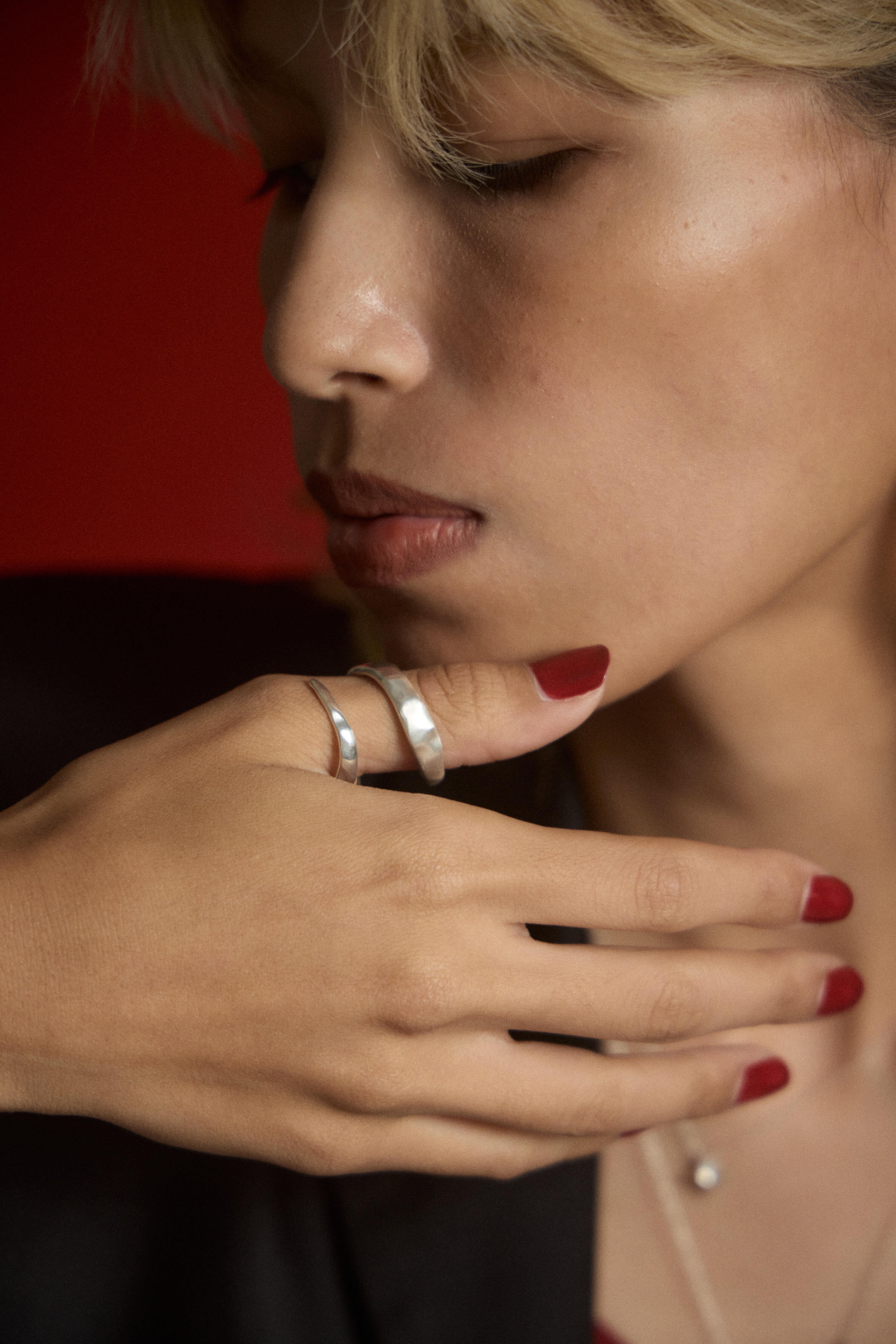 一般的にジュエリーに使用されるシルバーよりも加工が難しい素材ですが、RINMOでは熟練の職人が一つひとつ丁寧に叩きながら成形。