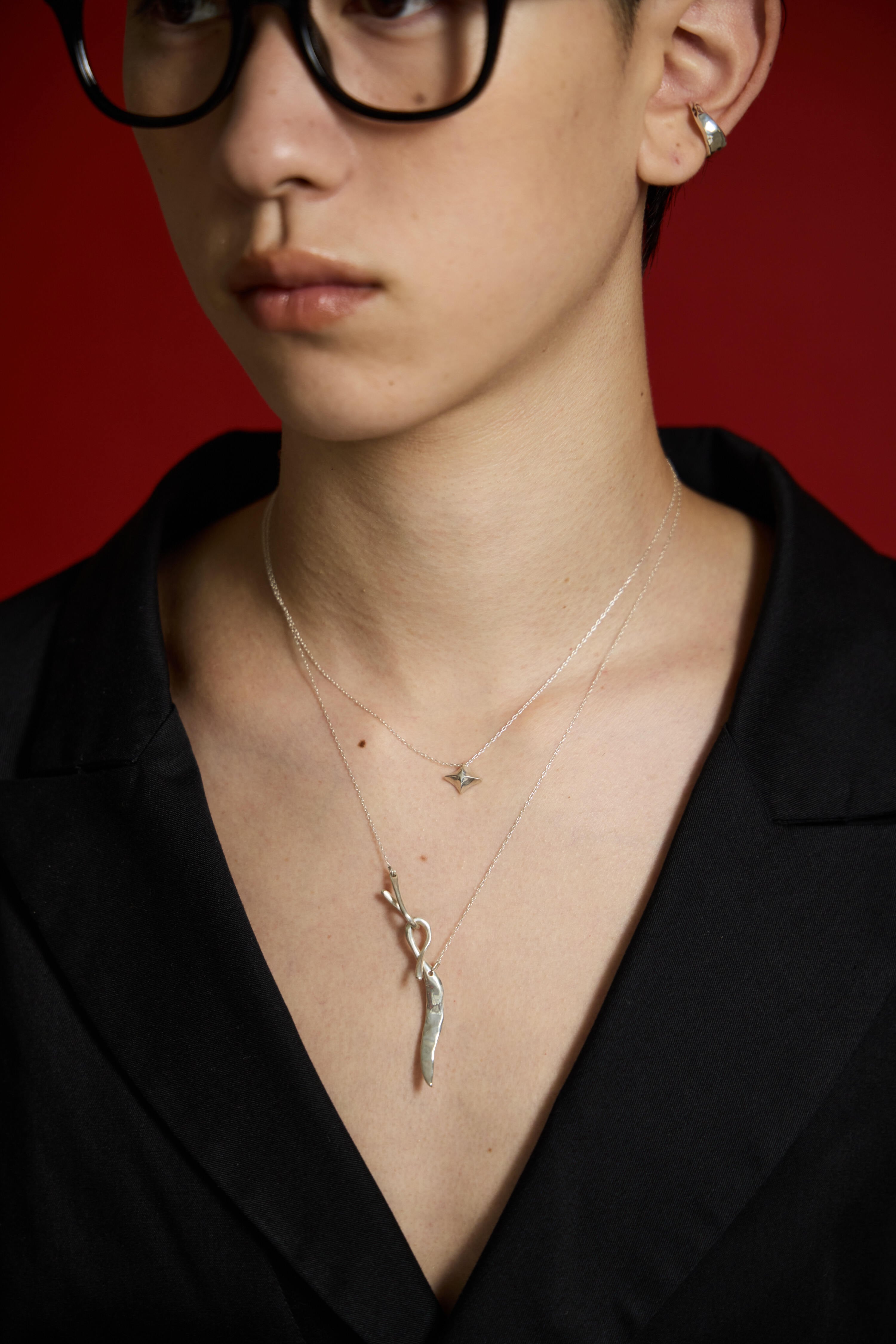 辛味成分であるカプサイシンを生み出す、果実の中にある「胎座(たいざ)」。小さい品種だと直径5センチに満たないほどの身体に熱を宿し、エネルギーを巡らせる“核”のような存在です。そんな内側にある胎座をモチーフにしたイヤーカフは、刺激を表現すべく鋭さを宿し、整ったバランスの中にエッジが浮かび上がる造形に。「静と動」「緊張と均衡」が同居する、研ぎ澄まされたデザインに仕上げました。
